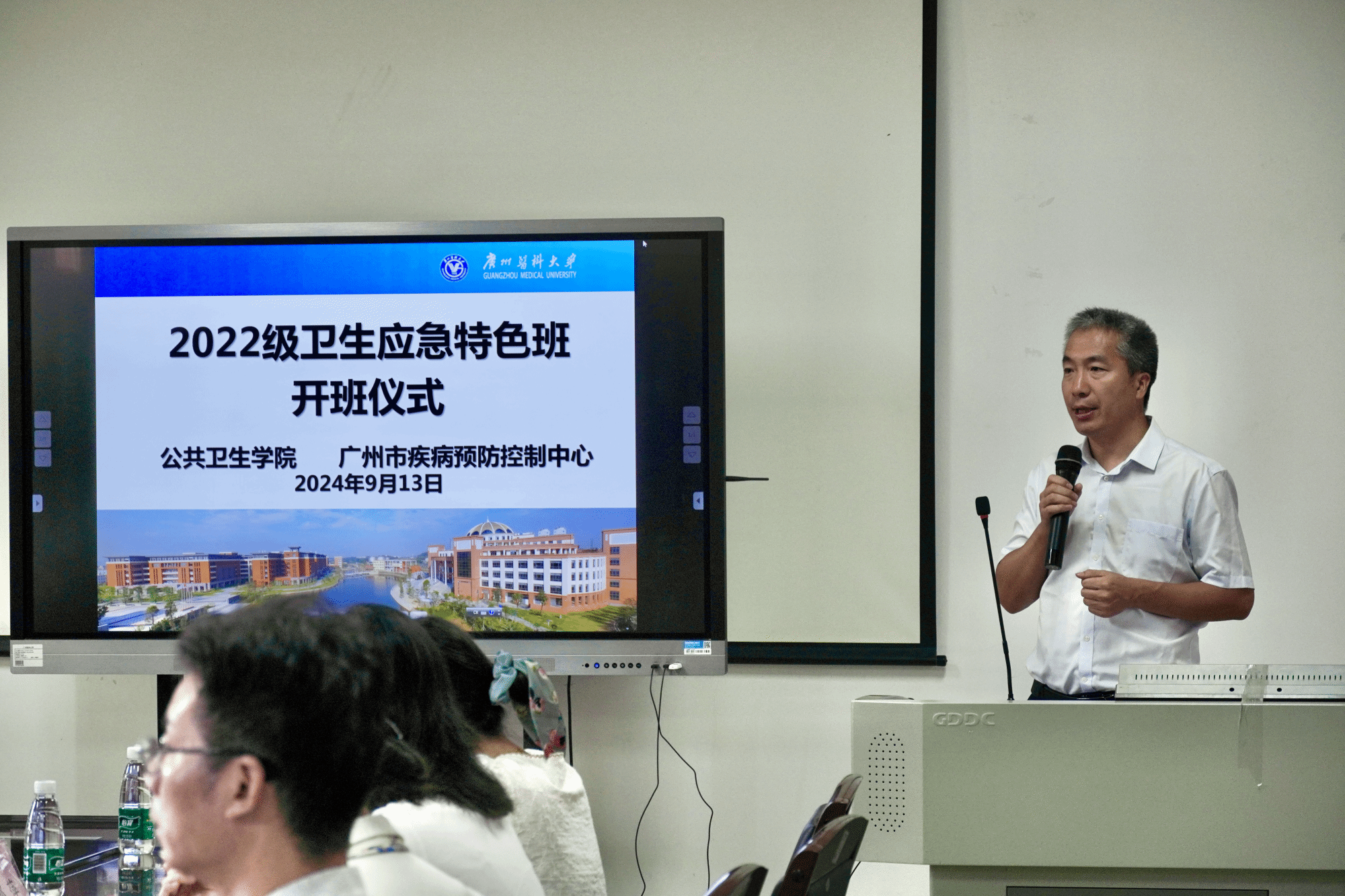 广州医科大学教务处郑建民处长,龙珠直播 蒋义国院长、李羽书记、杨巧媛副院长,广州市疾控科教信息部侯建荣副部长,龙珠直播 相关部门负责人、特色班教师代表及卫生应急特色班全体学生参加了此次活动。