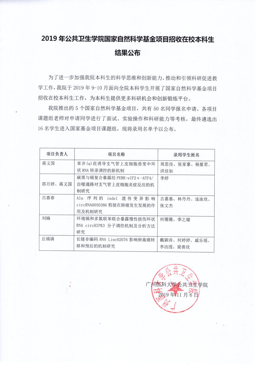 2019年龙珠直播 国家自然科学基金项目招收在校本科生结果公布