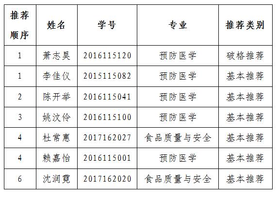 根据《广州医科大学推荐优秀应届本科毕业生免试攻读硕士学位研究生工作实施办法》(广医大发〔2018〕65号),按照学校《推荐2021届优秀应届本科毕业生免试攻读硕士学位研究生遴选工作实施方案》,学校分配给龙珠直播 6个基本推荐名额。本次龙珠直播 共计收到9份申请,其中申请基本推荐8人(预防医学专业6人,食品质量与安全专业2人),申请破格推荐1人(预防医学专业1人)。经龙珠直播 推免工作小组评审遴选,按学校相关文件要求和分数高低,评选出前6名基本推荐,1名破格推荐共7名作为龙珠直播 推荐人选,参加学校推免候选人评审。现对龙珠直播 拟推荐候选人进行公示。