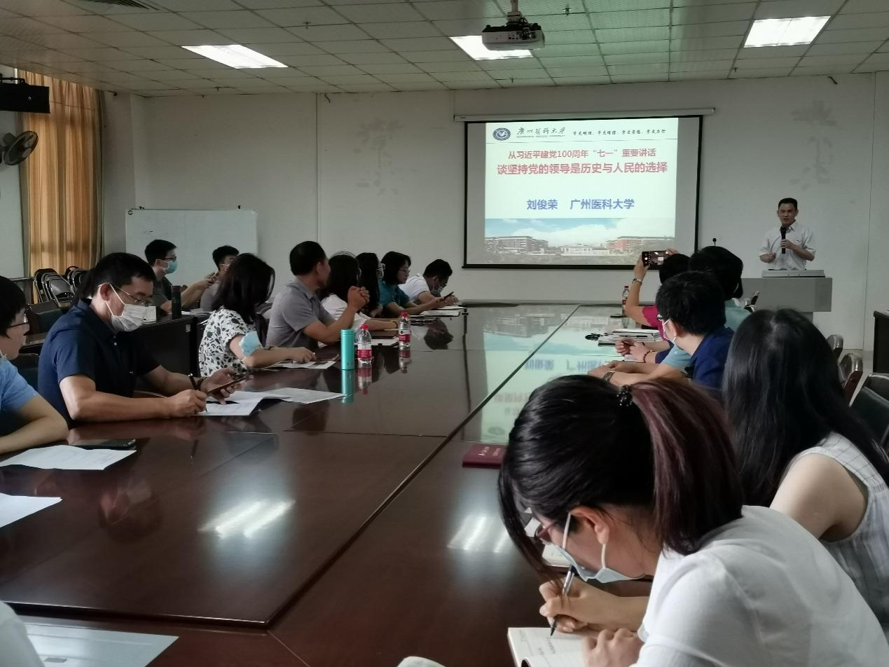 为深入学习习近平总书记今年7月1日在庆祝中国共产党成立100周年大会上的重要讲话精神(以下简称“七一”重要讲话精神),进一步推动党史学习教育工作,龙珠直播 9月举办了学习习近平总书记在“七一”重要讲话精神系列活动,学校领导胡丙杰副校长、龙珠直播 党总支蒋义国书记、刘宇珊副书记分别为所在支部党员上了专题党课;龙珠直播 同时邀请了马克思主义龙珠直播 刘俊荣院长为全体教工党员和研究生党员做专题宣讲会。