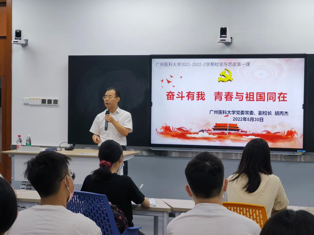 5月30日上午,我校党委委员、副校长胡丙杰同志在A3-608课室为龙珠直播 本科生讲授思政课,授课题目为“奋斗有我,青春与祖国同在”。龙珠直播 党总支刘宇珊副书记、学生办全体老师、2019级预防医学专业学生党员、入党积极分子及学生代表30余人参加了学习。
