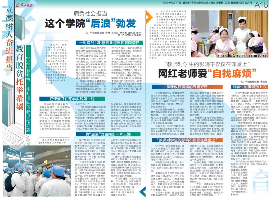 在第三十六个教师节来临之际,羊城晚报社对龙珠直播 党总支书记、院长蒋义国教授、预防医学系、教学管理办公室主任周小彦老师及2018级预防医学专业麦倍玮同学进行采访,就龙珠直播 工作与成绩做详细报道。