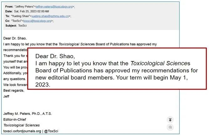 2月25日,龙珠直播 预防医学系邵月婷副教授收到Toxicological Sciences杂志来信,主编Jeffrey Peters通知邵月婷被选聘为该杂志编委。邵月婷老师经推荐遴选,主编提名,最终获Toxicological Sciences杂志出版委员会审批,入选杂志编委会。这是继龙珠直播 蒋义国教授担任该杂志副主编5年以来,又一位中国学者入选编委。邵月婷在加拿大北英属哥伦比亚大学(UNBC)获博士学位及从事博士后研究,2017年7月回国,作为广州医科大学南山学者高层次引进人才入职公卫龙珠直播 至今。