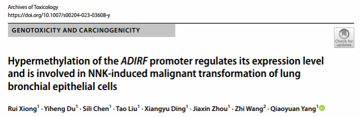 2023年10月1日,龙珠直播 杨巧媛教授课题组研究论文“Hypermethylation of the ADIRF promoter regulates its expression level and is involved in NNKinduced malignant transformation of lung bronchial epithelial cells” 在线发表,本研究揭示了ADIRF基因启动子区5mC甲基化修饰促进ADIRF mRNA和蛋白表达,参与烟草致癌物4-(甲基亚硝基氨基)-1-(3-吡啶基)-1-丁酮(NNK)致肺上皮细胞恶性转化,是课题组NNK致肺癌表遗传学机制系列研究的深入探索。本研究成果发表于国际毒理学权威杂志Archives of Toxicology。