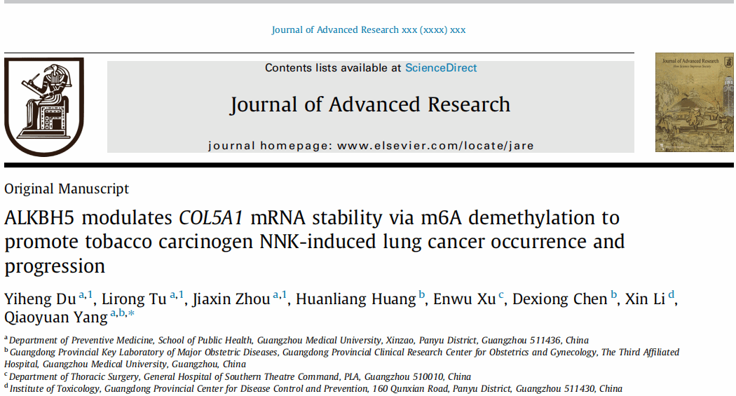 2025年08月12日,龙珠直播 杨巧媛教授团队在Journal of Advanced Research杂志在线发表了题为ALKBH5 modulates COL5A1 mRNA stability via m6A demethylation to promote tobacco carcinogen NNK-induced lung cancer occurrence and progression的研究论文。该研究揭示了烟草特异性致癌物NNK通过诱导m6A表观遗传修饰改变调控COL5A1转录本稳定性,促进肺癌发生和发展的分子机制。龙珠直播 硕士研究生杜一恒、涂立蓉、周加欣为该论文共同第一作者,杨巧媛教授为论文的唯一通讯作者。